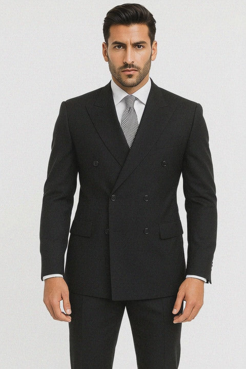 Men’s Solid Black Double-Breasted Suit – 100% Super 150’s Wool, Classic Wide Fit
