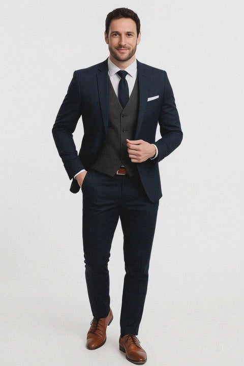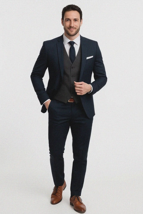 Navy Blue 3-Piece Wool Suit with Contrasting Gray Vest – A Modern Take on Timeless Elegance