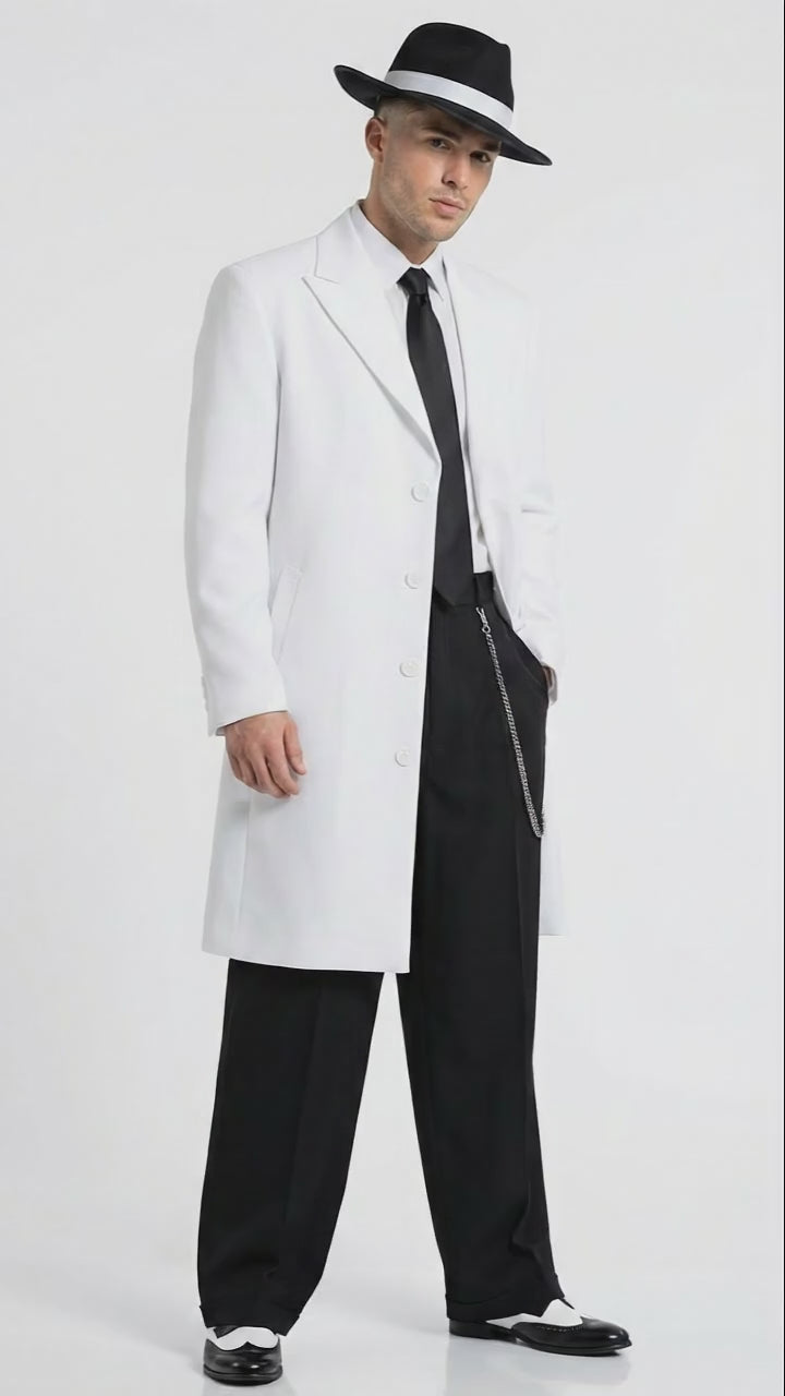 The crisp white color creates a striking contrast with the black pants, making this zoot suit ideal for themed parties, stage performances, costume events, nightlife occasions, and statement fashion looks. The long coat design reflects authentic gangster and mafia styling, offering a confident silhouette with dramatic presence.