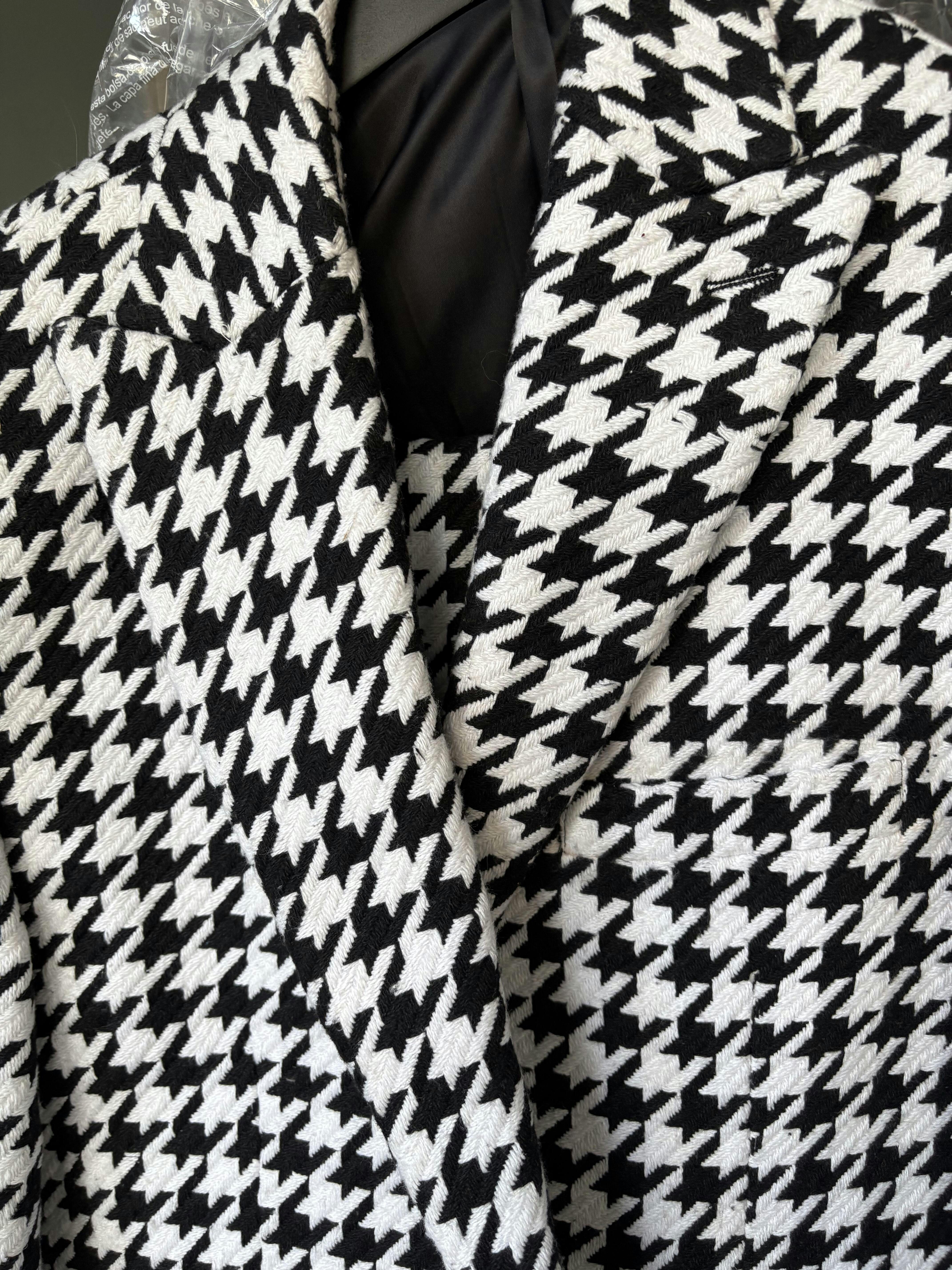 What sets this blazer apart is its timeless houndstooth pattern, a print that has stood the test of time in men’s fashion. The black and white contrast adds visual interest and texture, making it an elegant yet distinctive statement piece. Whether layered over a crisp dress shirt or a casual turtleneck, it exudes confidence, refinement, and understated luxury.
