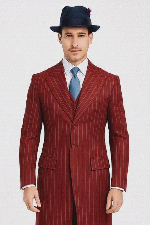 Mens Red Pinstripe Suit – Classic Long Coat Style with White Stripes