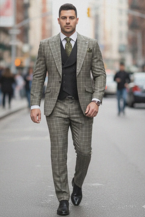 Statement Suits - Wool Suits - Peak Lapel Suits - Ticket Pocket - Modern Fit - Olive Suit