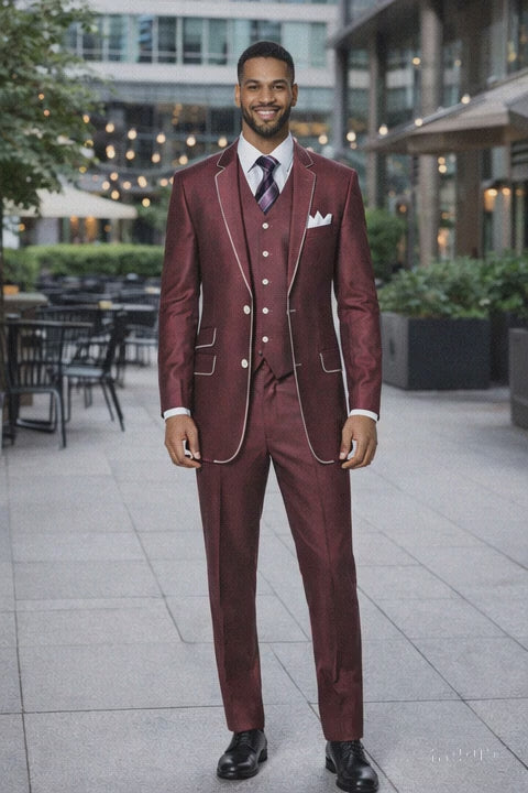 Slim Style Milano Suits by Milano Moda Men's Burgundy ~ Wine ~ Maroon Suit Shiny Flashy 3 Piece Burgundy Men's Sharkskin Suit