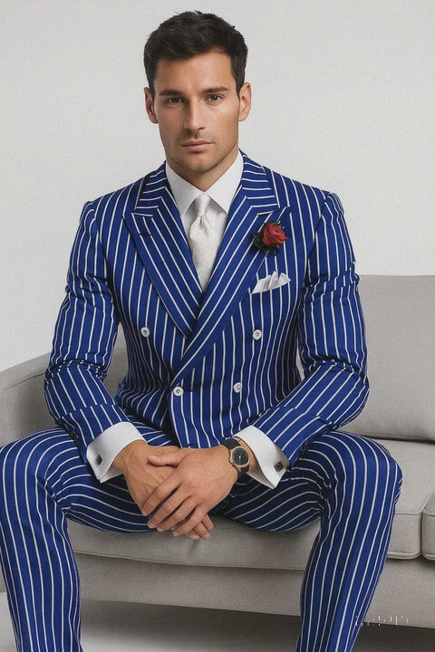 Men’s Royal Blue and White Pinstripe Double-Breasted Blazer – Modern Elegance with Classic Charm