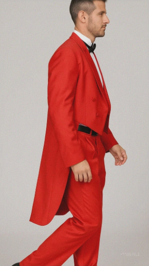 Make an unforgettable entrance with this bold red tuxedo tailcoat for men. Featuring a formal long-tail design, this classic tuxedo jacket is perfect for black-tie events, weddings, theatrical performances, or any occasion that calls for standout sophistication.