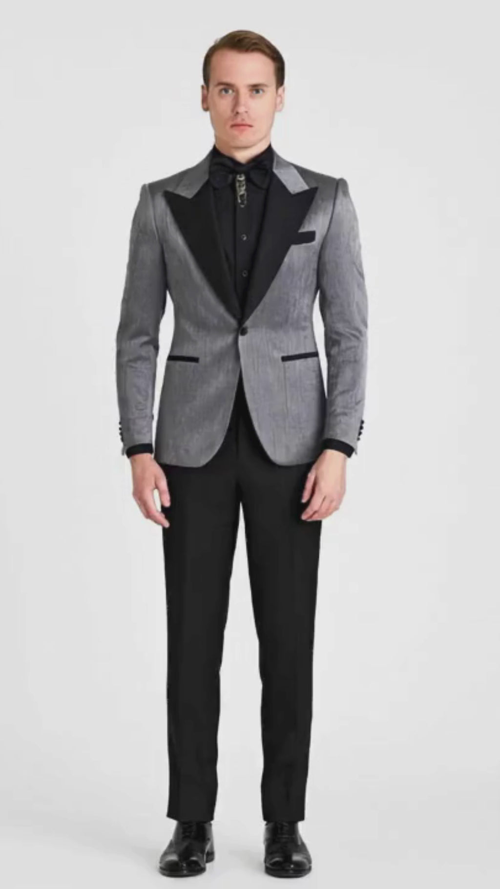Silver Metallic Tuxedo Suit with Black Satin Peak Lapel – Mens Slim Fit Formal Wedding and Prom Attire in Charcoal Grey With Pants