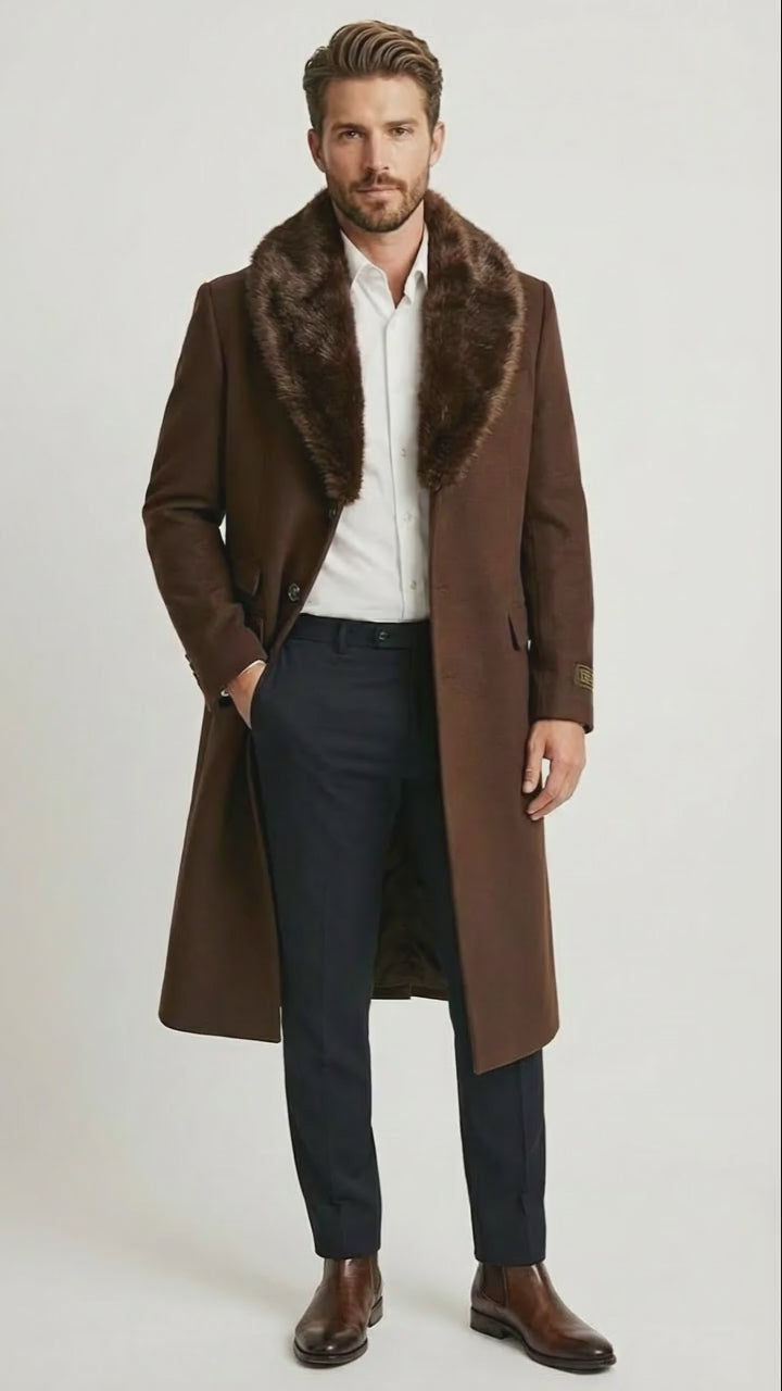 Men’s Overcoat, Winter Coat for Men, Brown Long Coat, Faux Fur Collar Coat, Formal Overcoat Men, Men’s Winter Outerwear, Luxury Men’s Coat