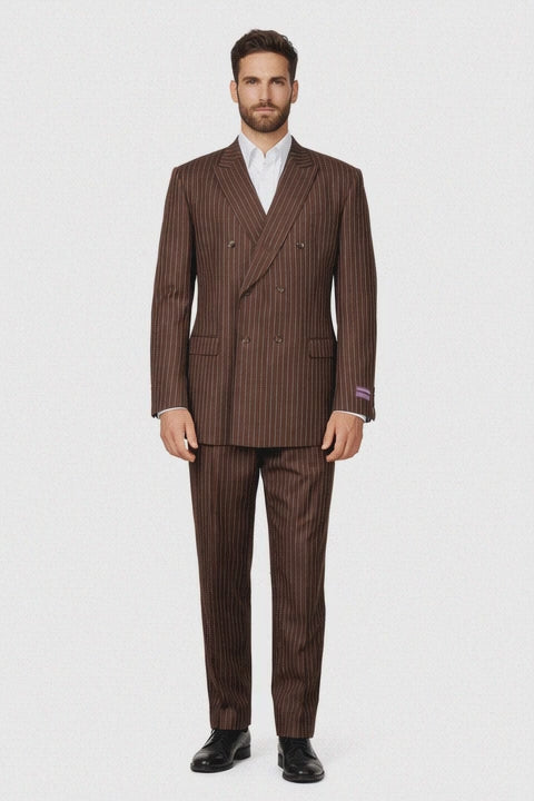 Men's Classic Fit Double Breasted Pinstripe 6 Button Peak Lapel Brown Suit