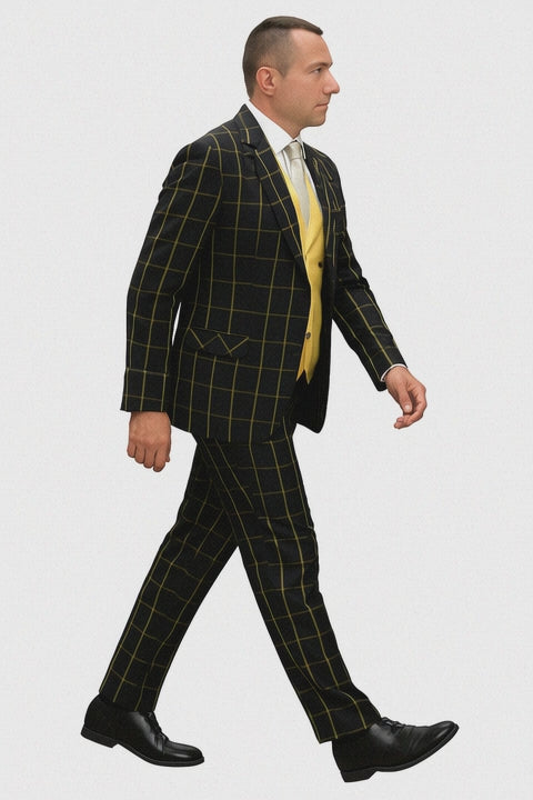 Athletic Suit - Black ~ Yellow Windowpane - Plaid Suit Modern Fit Side Vented Super 150's Wool Fabric - 100% Percent Wool Fabric Suit - Worsted Wool Business Suit