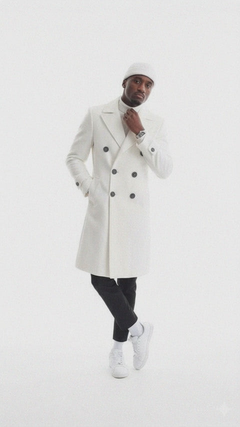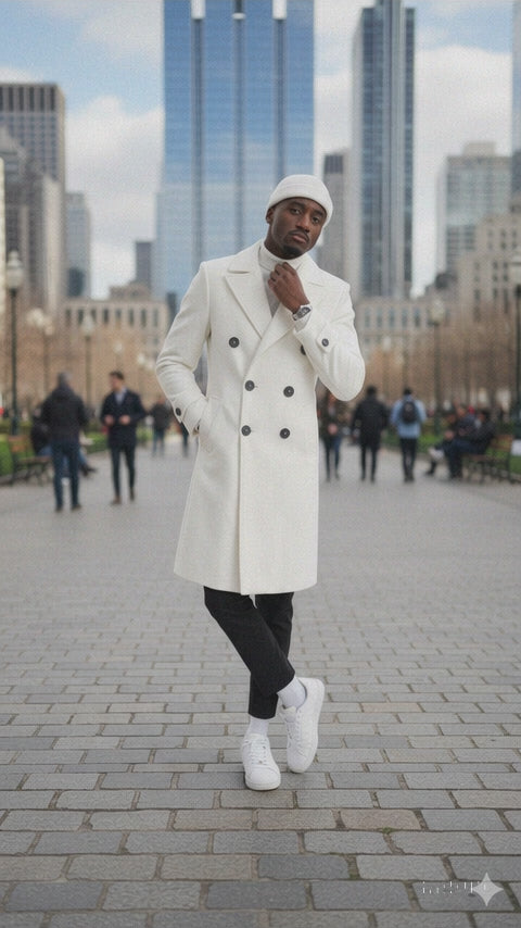 Command attention this winter with our Men’s Cashmere & Wool White Double Breasted Overcoat, a masterpiece of tailoring that blends old-world craftsmanship with contemporary style. Designed for the discerning gentleman, this overcoat embodies sophistication, warmth, and confidence — perfect for those who value refined elegance in every detail.