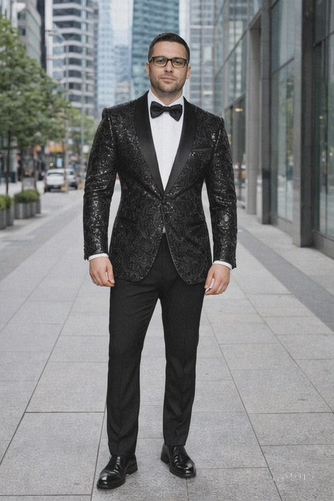 Make an unforgettable entrance with this Men’s Black Sharkskin Sequin Paisley Blazer. Designed for maximum impact, this one-button dinner jacket features a shimmering sequin paisley pattern layered over sleek sharkskin fabric. Whether you're hitting the stage, the red carpet, or a high-end party, this blazer ensures all eyes are on you.