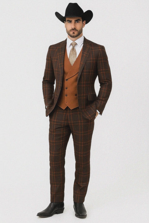Men’s Copper & Orange Windowpane 3-Piece Suit – Peak Lapel One-Button Jacket with Double-Breasted Vest