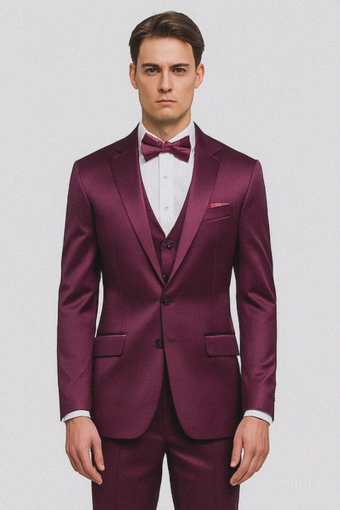 The deep purple color makes this suit a perfect choice for men who want to showcase individuality while maintaining a polished, professional appearance. Pair it with a crisp white dress shirt and black or dark brown shoes for a balanced, elegant look. Minimal accessories are recommended to let the suit’s rich satin texture and bold color remain the focal point of the outfit.