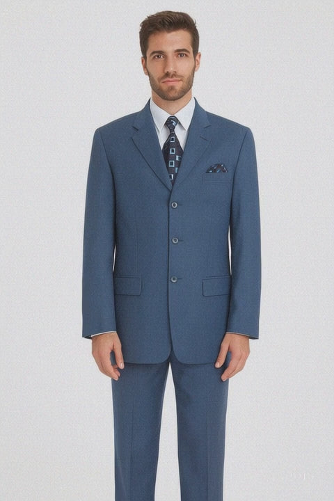 This suit is fantastic! The antique blue with teal tones gives it a classic yet modern look. The three-button jacket fits perfectly, and the pleated pants are comfortable. Wore it to a wedding and got so many compliments. -Brandon Lewis